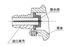 5.自吸泵的進(jìn)口束節(jié)重裝時,請注意阻水閥應(yīng)向正面,以便與阻水閥正面貼合保證白吸效果(見右下圖)。