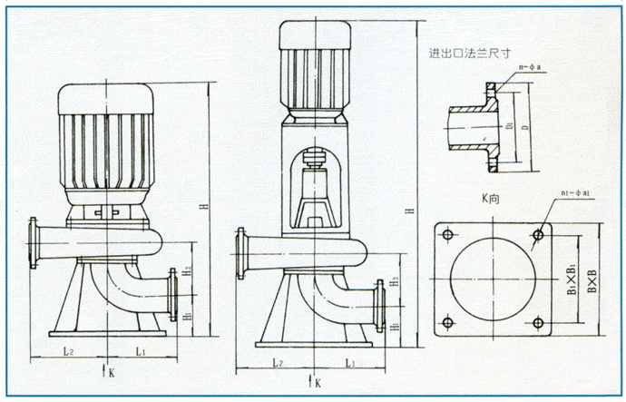 該系列泵具有兩種結(jié)構(gòu)形式,一是電機(jī)與泵直接同軸,二是采用聯(lián)軸器聯(lián)接,電機(jī)采用標(biāo)準(zhǔn)立式電機(jī)。其結(jié)構(gòu)圖如下,每種結(jié)構(gòu)形式具有兩種底座連接形式,一是進(jìn)口水平吸入,具有轉(zhuǎn)角功能,可根據(jù)使用要求,進(jìn)出口安放成0°、90°、180°、270°,便于管路連接,二是進(jìn)口軸向吸入,便于立式安裝。