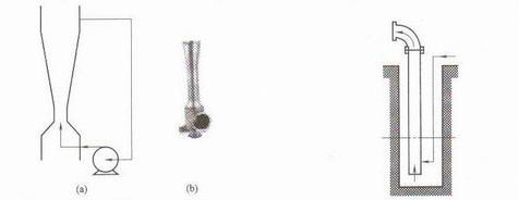 空氣提升泵(圖3-39)嚴格意義上來說并不是一種泵,因為其并沒有實現(xiàn)任何程度的速度和壓力的轉(zhuǎn)換。空氣或其他氣體通人提升管底端并與液體混合,因氣液混合物密度