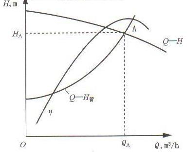江同以系統(tǒng)中泵的性能曲線與管路性能曲線,用同樣的比例遲會(huì)在同一張圖上,則這兩條曲線的交點(diǎn)A稱(chēng)為系統(tǒng)的工作。如圖6-1所示。A點(diǎn)即在泵的Q—H曲線上,也在管路的 Q—H管曲線上。從泵角度講,QA、HA表示以流量QA通過(guò)泵,由泵給液體提供能量是HA;從管路角度講QA、HA表示以流量QA通過(guò)管路時(shí),管路所需要的能量是HA。即Q泵+Q管=QA,H泵=H管=HA,所以在A點(diǎn)工作時(shí),工作穩(wěn)定,稱(chēng)為系統(tǒng)的工作點(diǎn)。