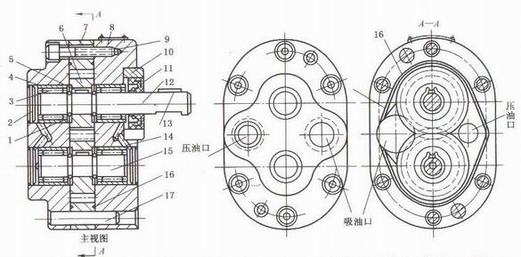 11—密封環(huán):12—長(zhǎng)軸:13—鍵:14—泄漏通道:15—短軸:16—卸荷溝:17—圓注銷