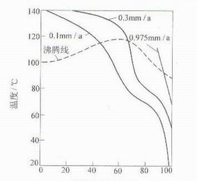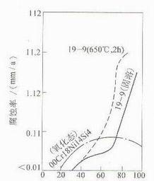 圖2-1是00Cr19Ni11、圖2-2是00Cr18Ni4Si4不銹鋼在硝酸中的腐蝕數(shù)據(jù)曲線。在硝酸中,含鉬的奧氏體不銹鋼是不耐蝕的,尤其在沸騰的硝酸中更是如此,因此,含鉬的奧氏體不銹鋼通常不在硝酸中使用。