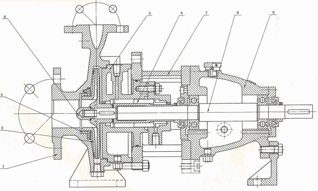 離心泵是由許多零件組成的,根據(jù)工作時(shí)各部件所處的工作狀態(tài),大致可以分成三大類型:轉(zhuǎn)動(dòng)部件、固定部件和交接部件。