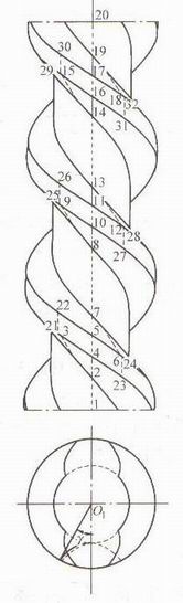 類密封性是指共軛的螺桿螺旋型面的嚙合線在螺桿螺旋橫截面上的投影嚙合線連續(xù),在理論上嚙合線能將相鄰的螺旋槽有效地隔開。這是排出腔和吸入腔完全隔開的必要條件。類密封性也就是在本章第二節(jié)中提到的對螺桿螺旋齒形曲線的要求。不銹鋼三螺桿泵理論螺旋型面的嚙合線形狀如圖3-3所示。采用擺線齒形曲線就是為了得到圓弧形的嚙合線。這在本章第二節(jié)已論證過,在理論上是安全符合類密封性的要求。從圖3-13繪制的螺桿螺旋嚙合的密封線可以看出:互相嚙合的螺桿螺旋接觸線能將螺旋槽隔成互不相同的兩部分。從動螺桿的螺旋棱邊6-7和8-9;和主動螺桿螺旋型面上的6-7和8-9相接觸,從動螺桿螺旋型面齒頂圓表面的接觸線7-8和主動螺桿螺旋型面齒根圓表面7-8相接觸,這樣就使主動螺桿的螺旋槽以接觸線5-6-7-8-9和從動螺桿上的6-7-8-9-10分隔成互不相通的兩部分空間。這些接觸線即為螺桿螺旋嚙合的密封線,它們在螺桿螺旋面上都是連續(xù)的,而且每隔半個導程(即一個螺距)重復出現(xiàn)。因此,在理論上螺桿螺旋互相嚙合時,這些密封線能將螺旋槽分割成互不相通,即互相密封的兩部分。擺線齒型嚙合的密封線在橫截面上的投影為圓弧形,故完全符合類密封性的要求。