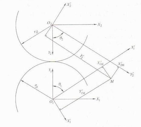 由圖1-10所示:若兩根互相嚙合的螺桿螺旋的節(jié)圓半徑分別為r和r 。螺桿1的固定坐標(biāo)系為X1O1Y1,螺桿1的齒形曲線隨著動坐標(biāo)系X1O1Y1轉(zhuǎn)動了O 角:螺桿2的固定坐標(biāo)系為X2O2Y2轉(zhuǎn)動了O2角:由于兩相互嚙合的螺桿旋轉(zhuǎn)時轉(zhuǎn)向必定相反,故O1和O2 為反向:為便于討論,現(xiàn)將X'1O'1Y'1動坐標(biāo)系中的任意點M(x'1,y'1)轉(zhuǎn)換到X1O1Y1固定坐標(biāo)系,坐標(biāo)系旋轉(zhuǎn)了O1角,即得。
