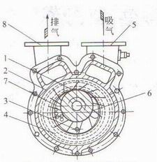 1—葉輪:2—泵體:3—注液孔:4—形成水環(huán)處:5—進(jìn)氣管:6—吸氣窗口:7—排氣窗口:8—排氣管