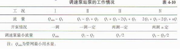 設(shè)有一送水泵站,己知*高日*大時(shí)供水量為Q,經(jīng)管網(wǎng)平差后相應(yīng)的泵站揚(yáng)程為H ,現(xiàn)考慮變速時(shí)設(shè)計(jì)工況點(diǎn)流量為Q:選用定速泵n臺,其額定轉(zhuǎn)速時(shí)設(shè)計(jì)工況點(diǎn)流量為Q2。為適應(yīng)泵站工況點(diǎn)變化(流量的變化),泵的開啟情況見表4-10