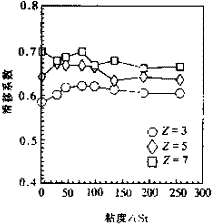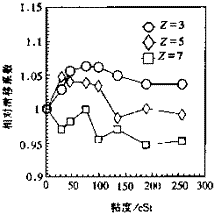 圖4表示不同葉片數(shù)條件下,滑移系數(shù)隨粘度的變化關(guān)系曲線。由圖可見,滑移系數(shù)隨粘度的變化關(guān)系曲線取決于葉片數(shù)。當(dāng)葉片數(shù)較少(Z=3)時(shí),滑移系數(shù)隨粘度增大而增加,直到粘度大于75cSt以后,略有減小,但都比輸送清水時(shí)的大。當(dāng)葉片數(shù)中等(Z=5)時(shí),當(dāng)粘度在20~100cSt范圍內(nèi),滑移系數(shù)達(dá)到值,以后隨粘度增大而減小,接近輸送清水時(shí)的滑移系數(shù)值。當(dāng)葉片數(shù)較多(Z=7)時(shí),滑移系數(shù)隨粘度增大而減小,比輸送清水時(shí)的小。圖5表示不同葉片數(shù)時(shí)相對(duì)滑移系數(shù)隨粘度的變化關(guān)系。相對(duì)滑移系數(shù)是指輸送粘油時(shí)的滑移系數(shù)與輸送清水時(shí)的滑移系數(shù)之比。該圖反映的變化規(guī)律與圖4完全一致。