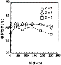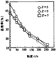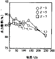 2.3 水力效率 圖6表示不同葉片數(shù)條件下水力效率隨粘度的變化關(guān)系。當(dāng)粘度低于200cSt時(shí),Z=5葉輪水力效率比其它葉輪高;當(dāng)粘度高于200cSt時(shí),Z=3葉輪比其它葉輪高。這種變化趨勢(shì)與泵總效率隨粘度的變化情況很一致,見圖9。