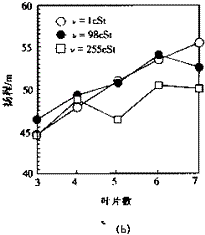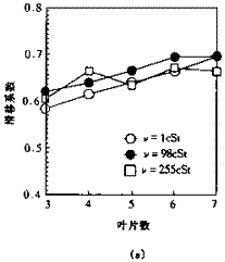 圖3(a)表示在粘度為1cSt(水)、98cSt(油)和255cSt(油)條件下,采用本文方法計(jì)算的滑移系數(shù)隨葉片數(shù)的變化曲線。圖3(b)為實(shí)驗(yàn)測(cè)得的工況揚(yáng)程。由圖可見,滑移系數(shù)隨葉片數(shù)的變化規(guī)律與揚(yáng)程隨葉片數(shù)的變化規(guī)律完全一致,再次表明本文計(jì)算方法是合理的。總體上,輸送粘油時(shí)滑移系數(shù)與葉片數(shù)的關(guān)系基本還是線性的。