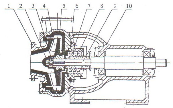 1、泵蓋2、拼帽3、防轉(zhuǎn)螺母4、葉輪、5、泵體6、密封盒7、油封8、軸套9、主軸10、軸承座