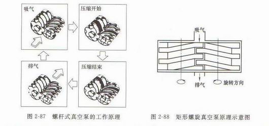 (2) 矩形螺旋式真空泵,它由矩形段面的右螺旋和左螺旋的一對轉子相嚙合,由同步齒輪帶動實現非接觸式的高速運轉,氣體有上側進入,在泵腔內壓縮,由轉子下端排除,轉子旋轉一周排氣一次。由于轉子和泵體內形成一種螺旋密封結構,矩形斷面間隙泄露較少,加上它的螺旋圈數多,故可以得到比螺桿式泵較高的壓縮比。這種泵可以從105Pa 抽到極限壓力10-1Pa,通常抽速為40-80m3/h.。矩形螺旋真空泵原理示意圖如圖2-88所示。