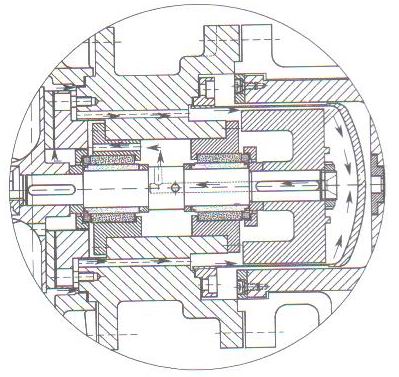 從圖2-3中箭頭所示,可看出潤(rùn)滑介質(zhì)由高壓進(jìn)→葉輪背葉片→高壓出的循環(huán)模式,流通順暢,也可解決易汽化介質(zhì)所產(chǎn)生的氣蝕問(wèn)題,保證了泵的性能。