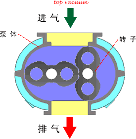 羅茨泵的結(jié)構(gòu)如圖所示。在泵腔內(nèi),有二個(gè)“8”字形的轉(zhuǎn)子相互垂直地安裝在一對(duì)平行軸上,由傳動(dòng)比為1的一對(duì)齒輪帶動(dòng)作彼此反向的同步旋轉(zhuǎn)運(yùn)動(dòng)。在轉(zhuǎn)子之間,轉(zhuǎn)子與泵殼內(nèi)壁之間,保持有一定的間隙,可以實(shí)現(xiàn)高轉(zhuǎn)速運(yùn)行。由于羅茨泵是一種無內(nèi)壓縮的真空泵,通常壓縮比很低,故高、中真空泵需要前級(jí)泵。